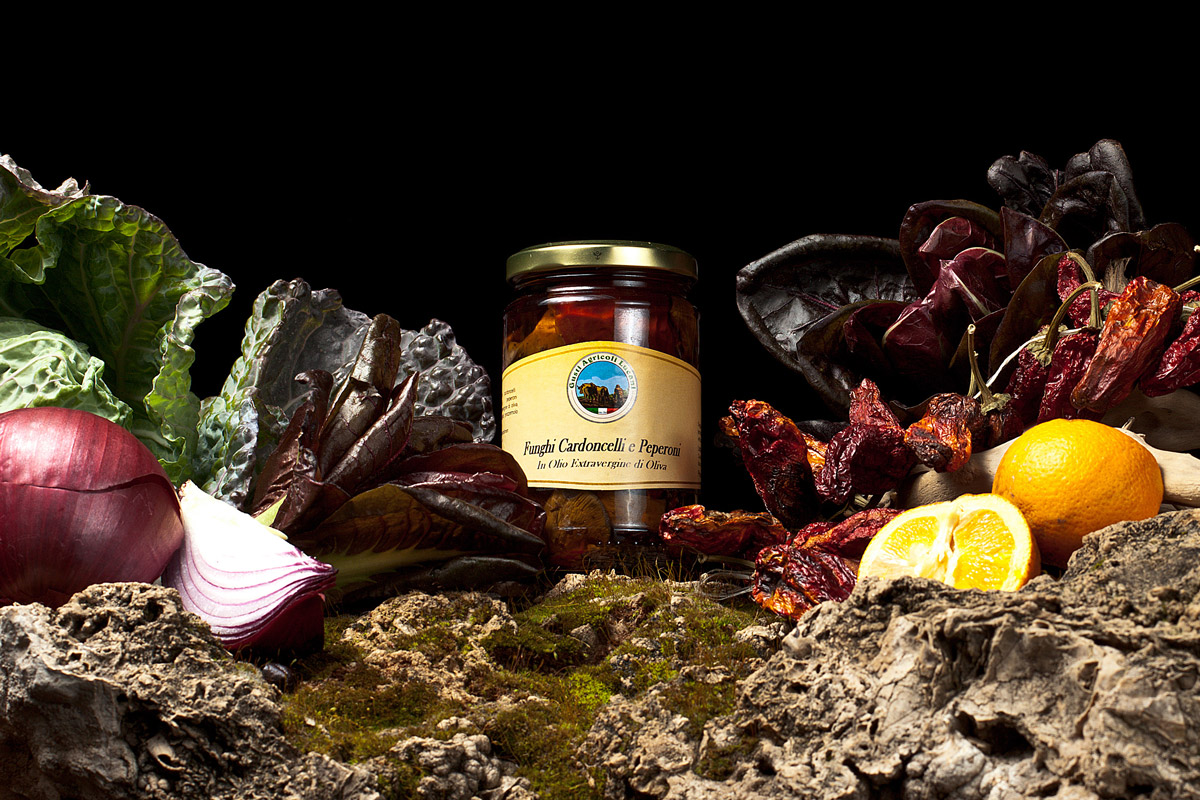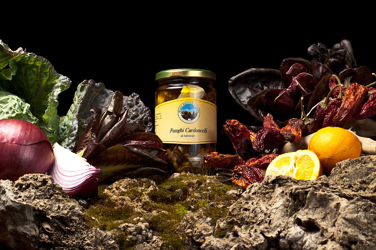 INGREDIENTI: Cardoncelli (Pleurotus eryngii), peperoni secchi (Capsicum annuum), aglio, origano, sale, aceto di vino, olio extravergine d’oliva. Conservare in ambiente fresco e asciutto.
